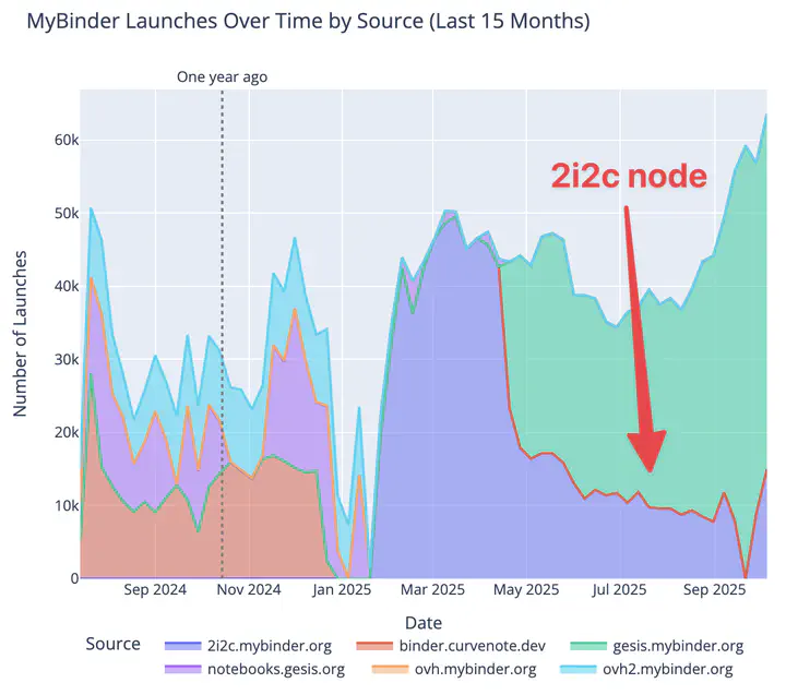 In Q3 of 2025, 2i2c.mybinder.org launched 118,083 reproducible sessions. We experienced a typical summer dip in sessions, had to